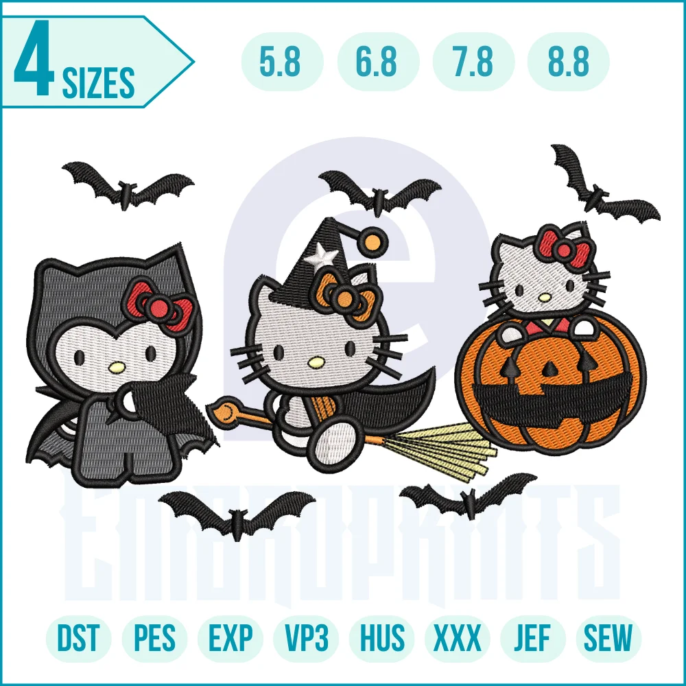 Three Hello Kitty Halloween embroidery, Hello Kitty pumpkin embroidery design, Cute Hello Kitty witch embroidery design, Hello Kitty digital embroidery design